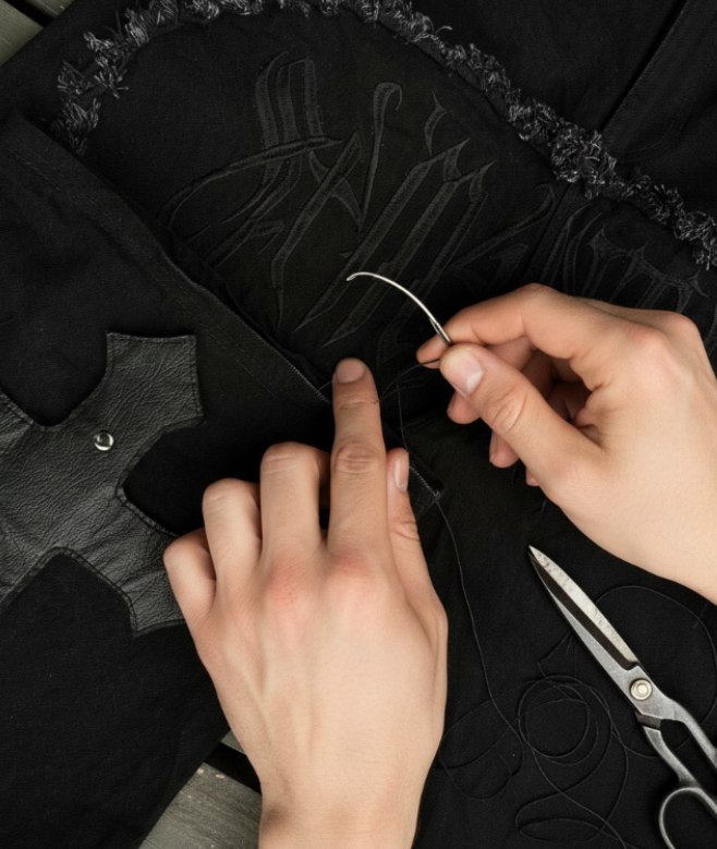 Bordado frontal "Samantha 444" agregado a su aplicación de mezclilla deshilachada.